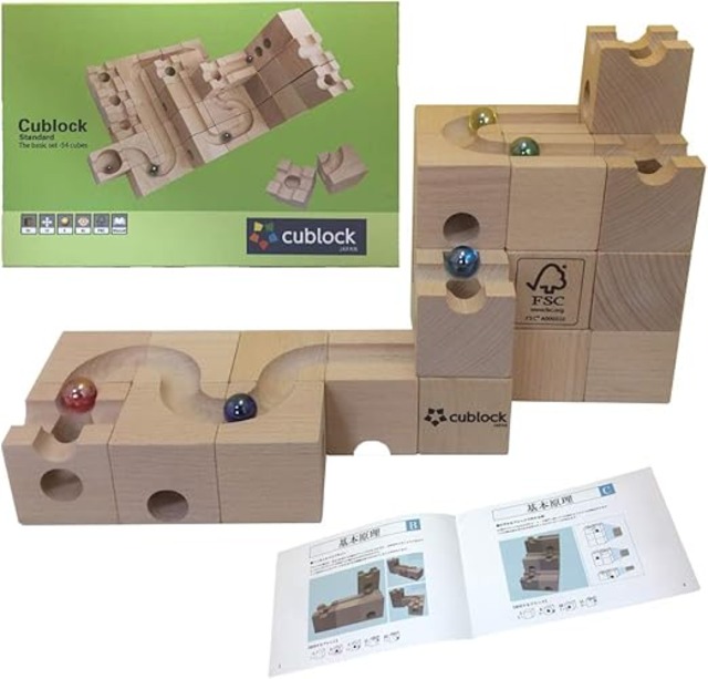 ビー玉の通る道を作る積み木ブロックです。それがCublock(キューブロック)です。 作りたいカタチをイメージし、それを実際にブロックで創作することによって、 お子様の物を作る感覚や想像力が養われます。 遊びの時間も有意義になること間違いなし。お子さまの想像力でたくさんの作品を創作できます。 ブロックサイズ/5cm×5cm×5cm 安心素材/木材はFSC認証を受けたヨーロッパ原産の上質なビーチ材(ブナ)を 使用して製作していますので、お子さまが口に入れても安心です。 セット内容/12種類の積み木ブロック54個、ビー玉5個、作り方ガイドブック(日本語) ギフト包装、ギフトメッセージ可、外箱は収納ケースとしても使えてお片付けも簡単。 保障/安心の180日保証。品質や検品には万全を期していますが、もし不具合や不良品などございましたら、 ご購入から180日以内の場合全額返金あるいは無料交換で対応させていただきます。 積み木を重ねていき、どのように組み立てると、どんな風にビー玉が転がるのか、 遊びながらお子様の思考力・創造力・集中力を養えます。