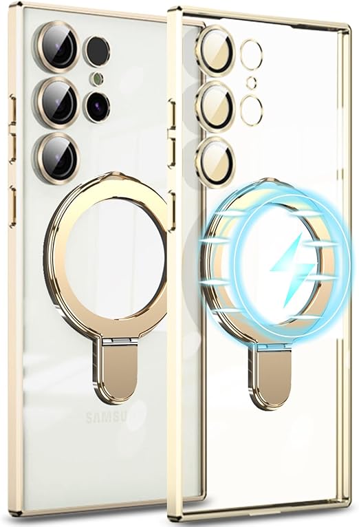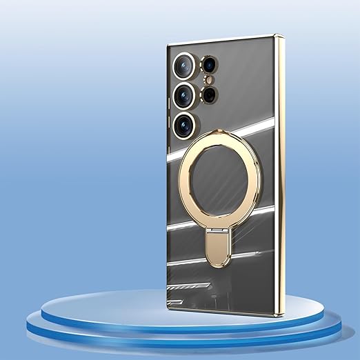 MuZiF Samsung Galaxy S25 Ultra 用 ケース リング付き MagSafe対応 クリア メッキ加工 カバー 車載ホルダー対応 多機能 レンズ保護 薄型軽量 耐衝撃構造 透明柔らかいTPU アイフォンS25 Ultra 用 磁気カバー ケース(Galaxy S25 Ultra,きんいろ) a
