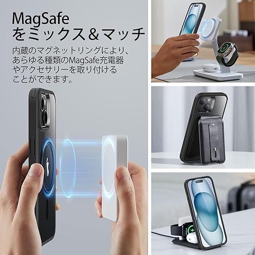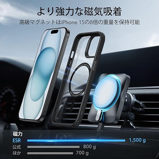 【高級磁石N52M付き・MagSafe対応】ESR iphone 15 plus ケースは1,500 gの吸着力を持つ強力な内蔵磁石により、iPhone 15の8倍以上の重量を吸着可能です。それにより、多種なマグネットアクセサリーとの素晴らしい組み合わせを実現でき、ガッチリ吸着する事でスマホケースを装着したiphone 15 plusを急速にワイヤレス充電できます。