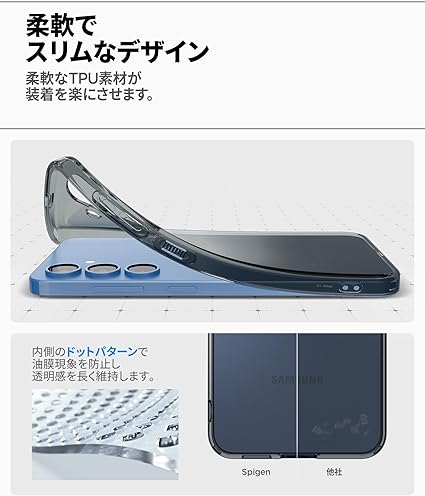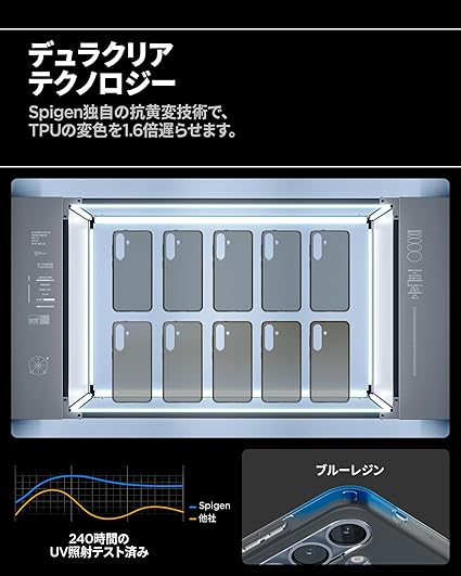 【透明さを守り抜くソフトな素材】黄変を抑制する特殊素材を採用しており、黄変を防ぎます。TPU(熱可塑性ポリウレタン)には補色を応用し作り上げられた『デュラクリア』が使用され、黄変を最小限に抑制しました。また、柔らかいTPU(熱可塑性ポリウレタン)素材を使用