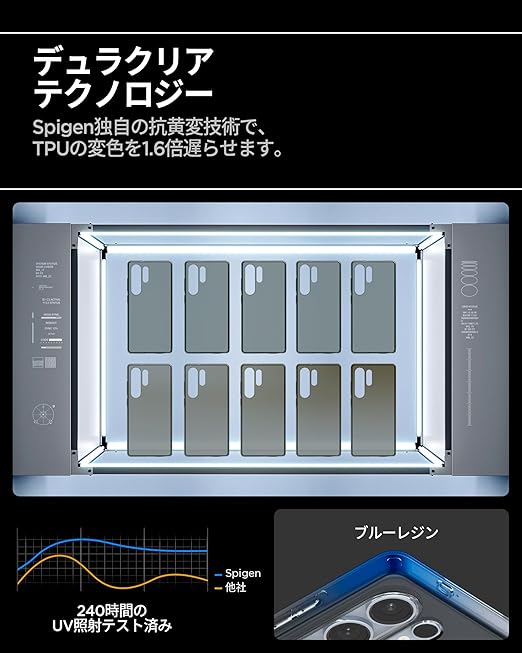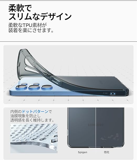 【透明さを守り抜くソフトな素材】黄変を抑制する特殊素材を採用しており、黄変を防ぎます。TPU(熱可塑性ポリウレタン)には補色を応用し作り上げられた『デュラクリア』が使用され、黄変を最小限に抑制しました。また、柔らかいTPU(熱可塑性ポリウレタン)素材を使用