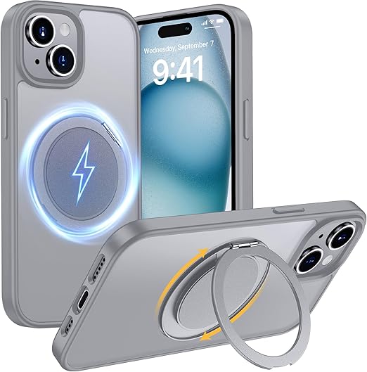 Aunote iPhone 15 ケース MagSafe対応 耐衝撃 360°回転スタンド 縦横両対応 マグネット搭載 黄変防止 マット感 アイフォン15 カバー 6.1インチ 半透明・グレー a
