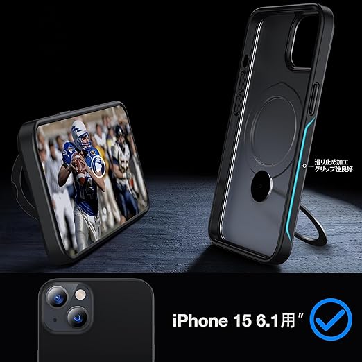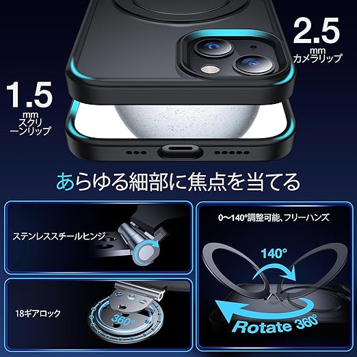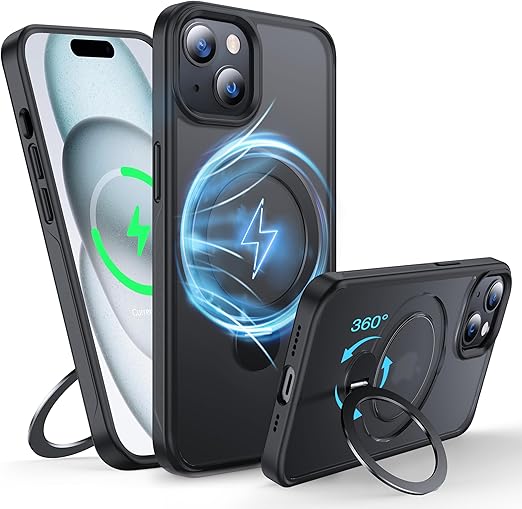 【米軍MIL規格・MagSafe対応】FNDMIL 360°回転 iPhone 15 用 ケース [滑り止めテクスチャ] [目に見えないスタンド] 縦横両対応 シリコンフレーム 半透明マットハードケース アイフォン15 用 ケース マグセーフ対応 ワイヤレス充電対応 薄型 (ブラック) a