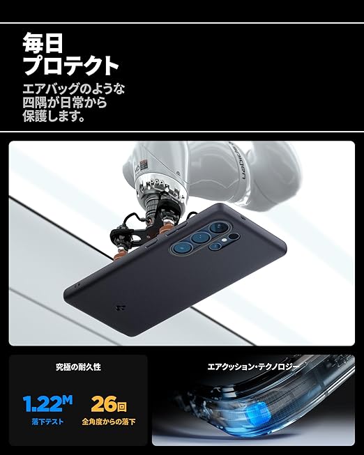 【米軍MIL規格取得/証明された保護能力】1.2mの高さから26回落下してもデバイスが無事な場合認められる米軍MIL規格「MIL-STD 810G-516.6」を取得しました。四隅で衝撃を吸収する「エアクッションテクノロジー」技術を採用しており、日常の衝撃