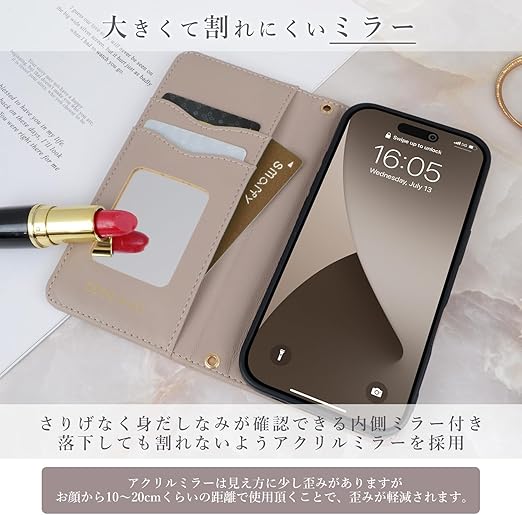 【特徴】 ・ふっくらしたキルティング ・開閉サポート付き ・カード収納付き×2ケ ・サイドポケット付き ・大きなミラー付き ・内部ケースはTPU ・ストラップホール付き