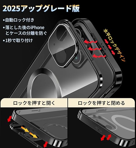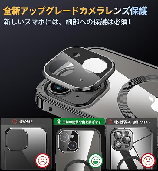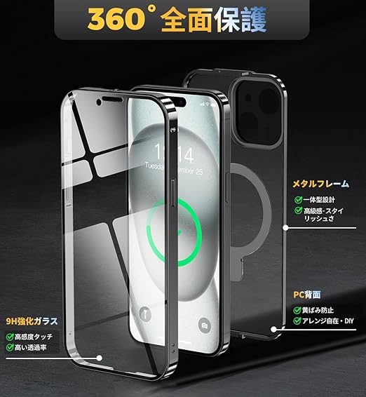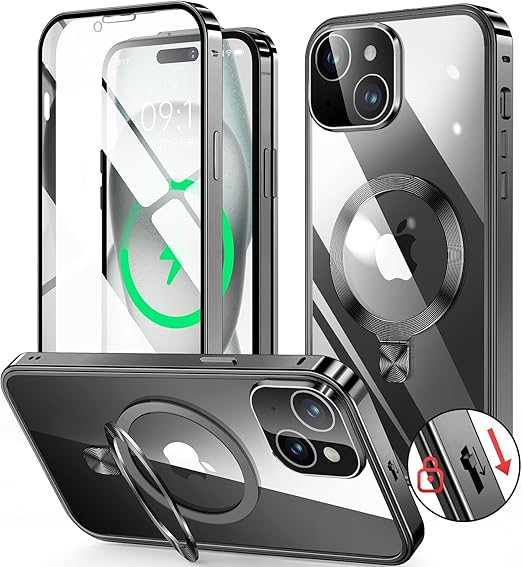 HGUTREY【スタンド機能付き・アクションボタン】 iPhone15 用 ケース クリア 【ロック付き】【CDリング・MagSafe対応】 9H強化ガラス PC背面 カメラレンズ保護 アイフォン15 ケース 両面 ストラップホール付き アルミバンパーケース メタルフレーム 耐衝撃 高感度タッチ ワイヤレス充電対応 アイホン15 用 ケース 6.1インチ(ブラック) a
