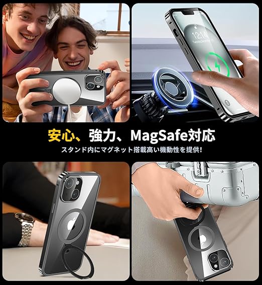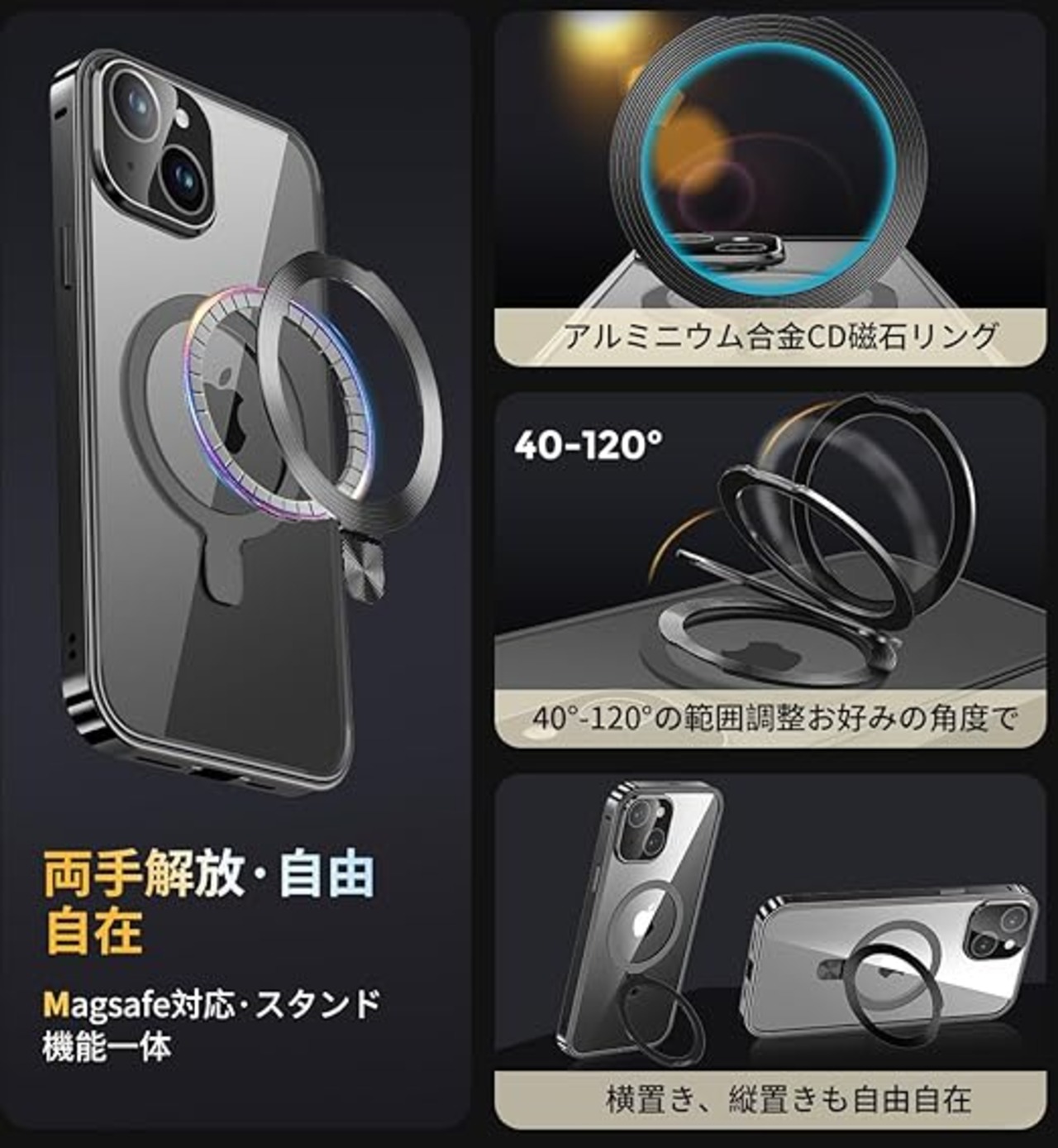 【全面革新!スタンド・CDリング・Magsafe対応】このあいふぉん15ケースは、動画鑑賞に便利なスタンド、CDパターンの質感の金属光沢のスマホリング、バッチリ付くMagsafe充電対応、多機能を一体化にしている、より便利で快適な暮らしを実現!このiPhone15 ケースは、高品質のアルミニウム合金CD磁石リングを搭載し、おしゃれで高級感が溢れています。3Way置き対応、縦横とも自由自在、40oー120o回転可能で、最適な視野角を調節できます。これからは、映画鑑賞、オンライン授業、リモート会議、