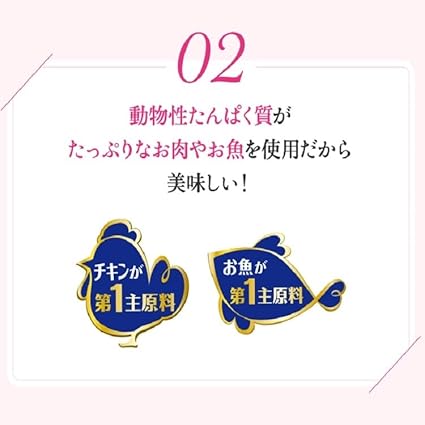 チキン、米、チキンミール、牛脂、えんどう豆でんぷん、コーングルテン、大麦、たんぱく加水分解物、酵母、ターキーミール、キャッサバ粉、モルトエキス、ぶどう糖、チーズ、ミネラル類(カルシウム、カリウム、ナトリウム、クロライド、鉄、銅、マンガン、亜鉛、ヨウ素、セレン)、酸味料、アミノ酸類(グリシン、タウリン)、ビタミン類(A、D、E、K、B1、B2、パントテン酸、ナイアシン、B6、葉酸、ビオチン、B12、コリン、C)、着色料(食用赤色40号、食用青色2号、食用黄色4号、食用黄色5号)、酸化防止剤(ブチル