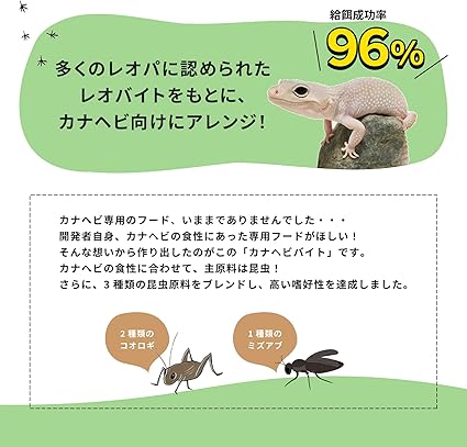 カナヘビバイトは昆虫粉末95%の、食いつき抜群の爬虫類向けの人工フードです。