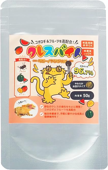 クレスバイト -ベビー/ヤング向け-はフルーツパウダーとコオロギ粉末を配合した食いつき抜群の爬虫類向けの人工フードです。