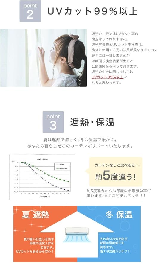 やや厚めで省エネ効果の高い生地です。断熱性44.5% 保温性32.8% (日本繊維製品品質技術センター調べ)