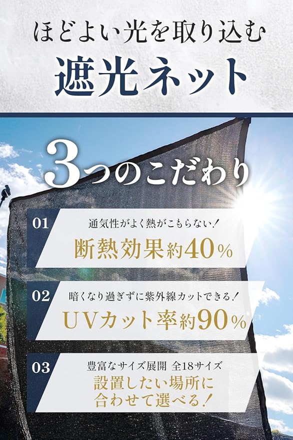 uvカット率約90%、遮光率90%、断熱効果約40%で完全に遮光しないことで、通気性がよく熱がこもらない構造です!