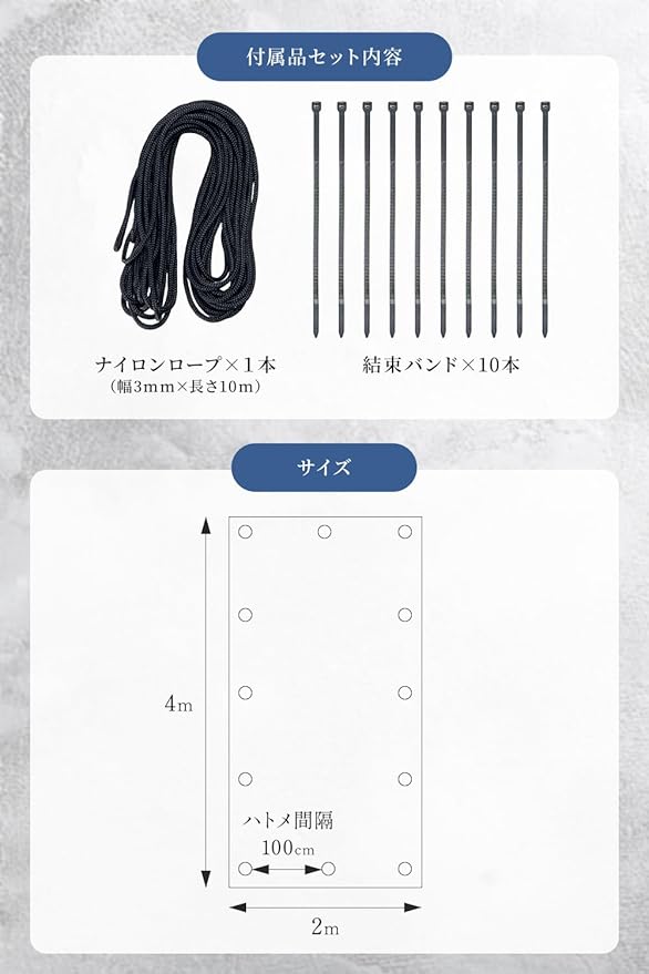 幅3mm×長さ10mの紐と結束バンドが10本付属してるので届いてすぐに設置が可能です!