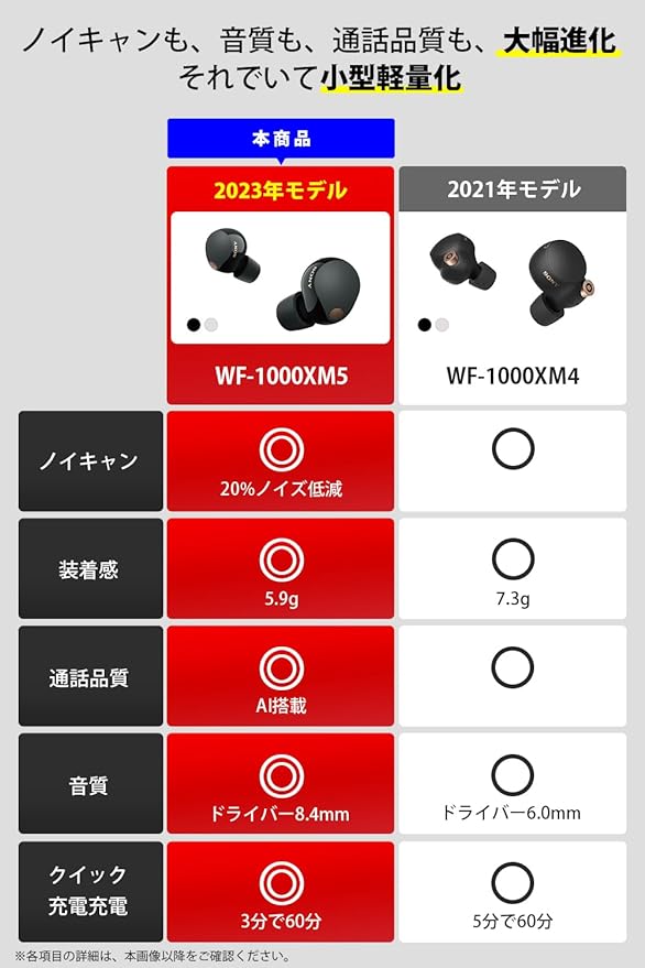世界最高クラスノイズキャンセリング(*) 統合プロセッサーV2と、高音質ノイズキャンセリングプロセッサーQN2eにより、ハイレベルなノイズキャンセリング処理、音質信号処理を可能にしました。 また「マルチノイズセンサーテクノロジー」によりデュアルフィードバックマイクとフィードフォワードマイク、片耳3つずつのノイズキャンセリングマイクを搭載し圧倒的ノイズキャンセリング性能を実現しました。 これによりWF-1000XM4比でさらに20%のノイズ低減を可能にし、いまだかつてない静寂の中で再現性の高い音質