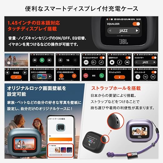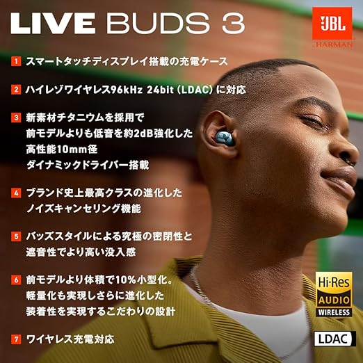 JBL LIVE BUDS 3 スマートタッチディスプレイ搭載 ワイヤレスイヤホン 小型 軽量 LDAC ハイレゾワイヤレス対応 ノイズキャンセリング 10mmダイナミックドライバー (ブルー) a