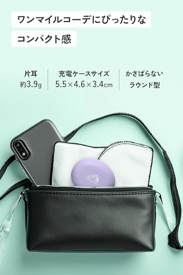 【コンパクトで持ち運びもしやすい充電ケース】 充電ケースは、本体のデザインに合わせてラウンド型を採用。質量は約30gと軽量で、手のひらに収まるコンパクト設計とし、持ち運びやすさにも配慮しました。