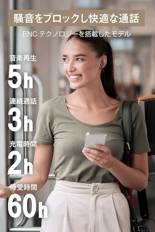 ⾳楽再⽣時間:最大約5.0時間(ノイズキャンセリングOFF)/約4.5時間(ノイズキャンセリングON)、連続通話時間:最大約3.0時間