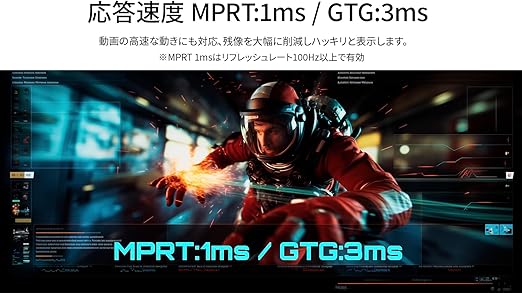 MPRT 1msの高速応答速度、180Hzの高速リフレッシュレートを実現、高精細で滑らかな表現を可能にし、より快適なゲームプレイを実現します。*MPRTはリフレッシュレート100Hz以上で可能。