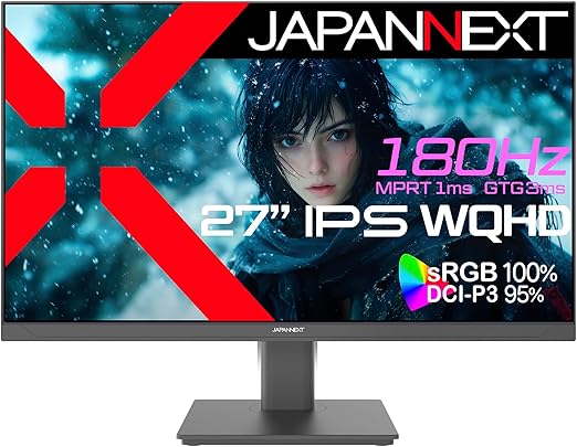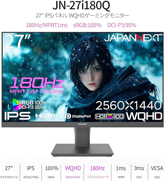 【Amazon.co.jp限定】27インチ IPSパネル搭載 180Hz対応 WQHD(2560x1440)解像度 ゲーミングモニター JN-27i180Q HDMI DP sRGB:100% DCI-P3:95% HDR400相当 PS5:120Hz(WQHD)接続対応 1ms(MPRT) a