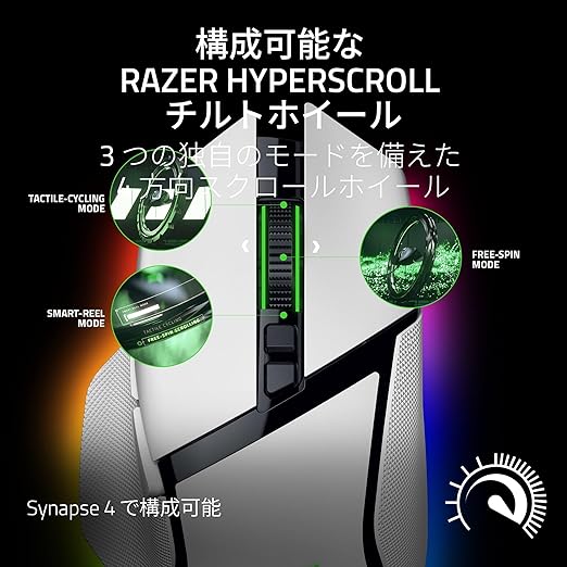 【構成可能な Razer HyperScroll チルトホイール - 3 つの独自のモードを備えた 4 方向スクロールホイール】 タクタイルサイクリングとスム