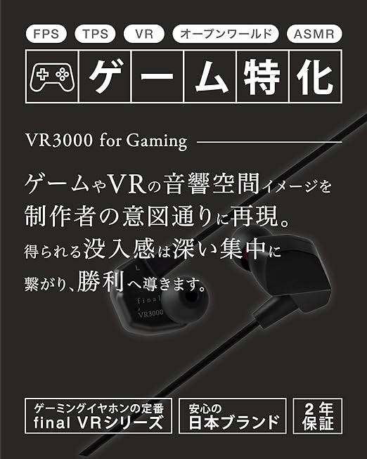 【音の方向感を再現する】ゲーム、ASMRや3Dサウンド用を謳うイヤホンの多くは、一聴した際の驚きを重視して低域や高域を誇張した音づくりがされています。しかし映像と共に使われる音はそのゲーム等のコンテンツの世界に没入することが目的であり、音に驚くことではありません。私たちはゲーム等のコンテンツに没入するためには、音源に込められた制作者の意図や狙いを正確に再現することが重要だと考えています。VR3000はこうした考え方に基づいて開発されたイヤホンです。