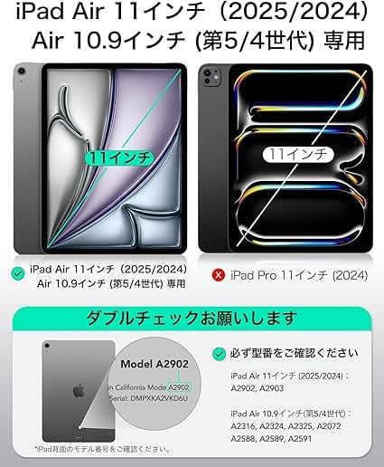 【互換性】:iPad Air 11インチ(2025/2024)、iPad Air 第5/4世代(2022/2020)専用です。モデル:A2902、A2903、A2316、A2324、A2325、A2072、A2588、A2589、A2591,他のiPadモデルと互換性がありません