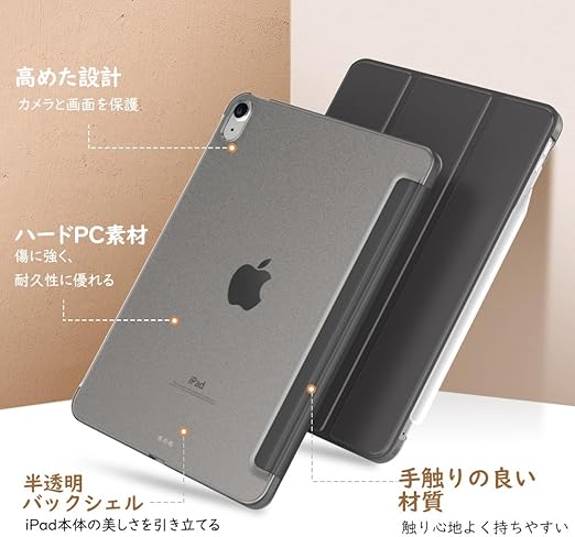 TiMOVO iPad Air 11インチ ケース M3/M2 第7/6世代 (2025/2024) iPad air 第5/4世代 ケース 10.9インチ iPadAir7/6/5/4 カバー 11インチ/10.9インチ PencilPro/第2世代ワイヤレス充電対応 PUレーザー 三つ折り オートスリープ機能 落下防止 手帳型 半透明 ダークグレー a