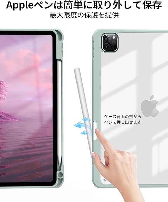 Aoub iPad Pro 11インチ ケース (2022/2021/2020) 第4/3/2世代 透明 バックカバー Apple Pencil 収納可能 Apple Pencil 2 ワイヤレス充電対応 三つ折スタンド スリープ機能 軽量 薄型 傷つけ防止 PU合成レザー TPU クリアバックカバー ライトグリーン a