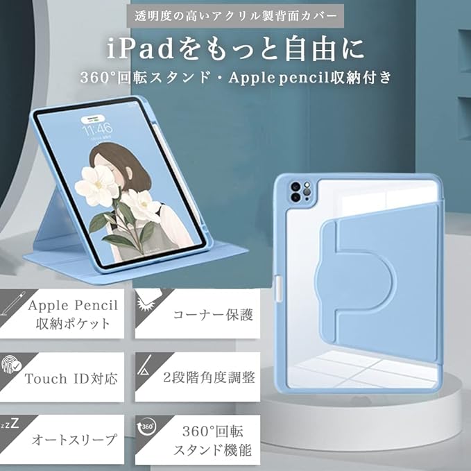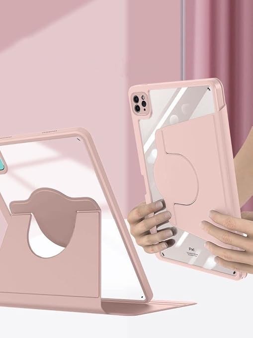 360°回転 iPad Air 11インチ M2 (2024) / iPad Air 第5世代 / 第4世代 ケース 縦置きスタンド 背面クリア アップルペンシル収納 iPad Air6 Air5 Air4 pro11 2022透明 ケース かわいい ペン収納 耐衝撃 軽量 薄型, ピンク a
