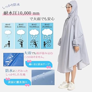【防水&耐摩が抜群】ナイロンオックスフォード素材は防水性、耐摩耗性に優れた素材です。表面には撥水加工、縫い目には防水加工を施しています。*レインコートにの表面には防水コーティングを持っています。風通しがなくて少し新品の匂いを含んで、お手元にレインポンチョが到着しましたら、陰干しされることをおすすめします。 匂いに敏感な方や気にされる方は、1度軽く洗って陰