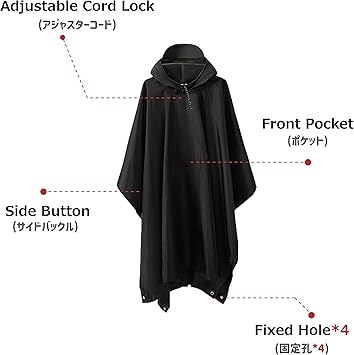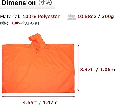 【フリーサイズポンチョ】長さ:106cm、幅:142cm、収納サイズ:14 × 17 (cm)、重量:300g、男女兼用。自転車対応、リュック・バックパックを背負った時も着用できま