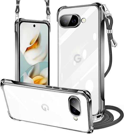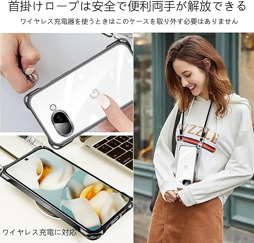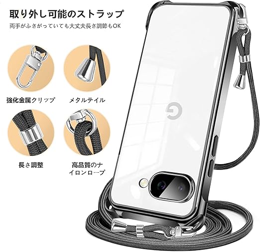 PAILAIMEN Google Pixel 9a ケース クリア ネック ショルダー pixel 9a ケース 耐衝撃 対応 ピクセル9a スマホケース 肩掛け 斜めかけ 縄掛け カバー メッキ加工 透明 TPU 薄軽型 ストラップ付き 携帯ケース ネックストラップ ショルダー 肩掛け 長さ調整可能 取り外し可能 落下防止 擦り傷防止(ブラック) a