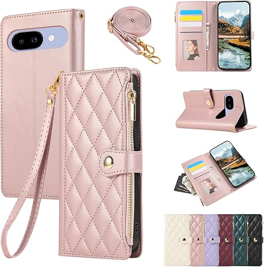 For Google Pixel 9aケース 手帳型 グーグルピクセ9aケース ひし形柄 Pixel9a ケース ショルダー 適用 Google Pixel 9a カバー 人気 女性 対応 Googleピクセル9a ケース 肩掛け カード収納 ジップ付き財布 横置き機能 シンプル お洒落 スマホケース (ローズピンク) a