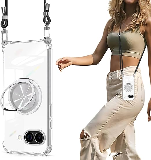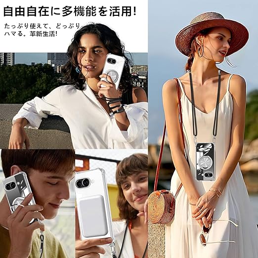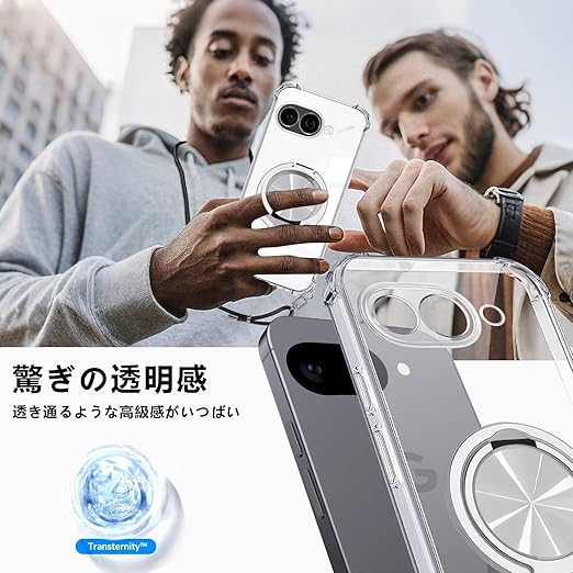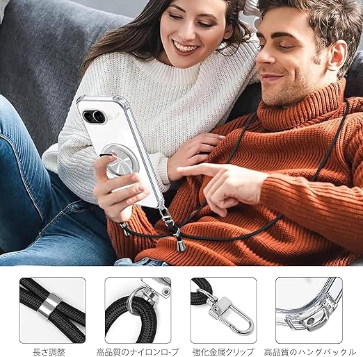 Google Pixel 9A ケース クリア リング付き ショルダー pixel 9a ケース MagSafe対応 ワイヤレス充電 透明 耐衝撃 ピクセル9a 対応 カバー TPU 透明 肩掛け 斜めかけ 縄掛け スタンド機能 360°回転 縦横両対応 マグネット搭載 紐付き 斜めがけ 織りストラップ付き ネックストラップ 紛失防止(縄掛け-ブラック) a