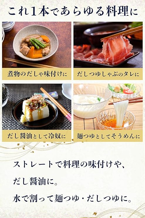 【あらゆる料理に使える】素材の旨味をじっくり引き出したつゆなので、これ1本であらゆる料理に使えます。めんつゆ・かけつゆ・丼つゆとしてはもちろん、水との割り方で煮物・惣菜の味付け、万能つゆとしてもお使いいただけます。