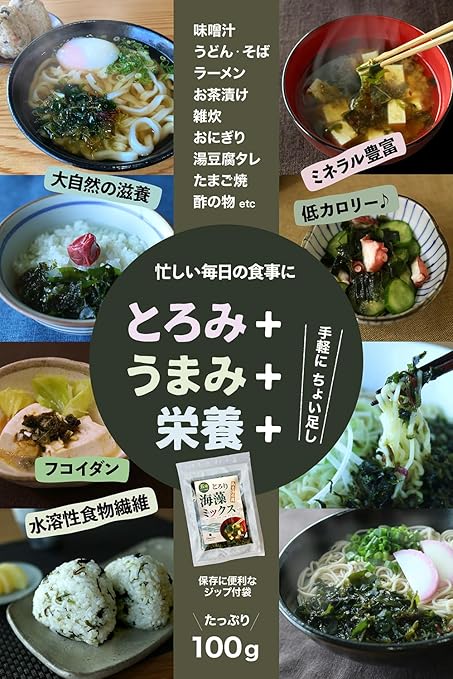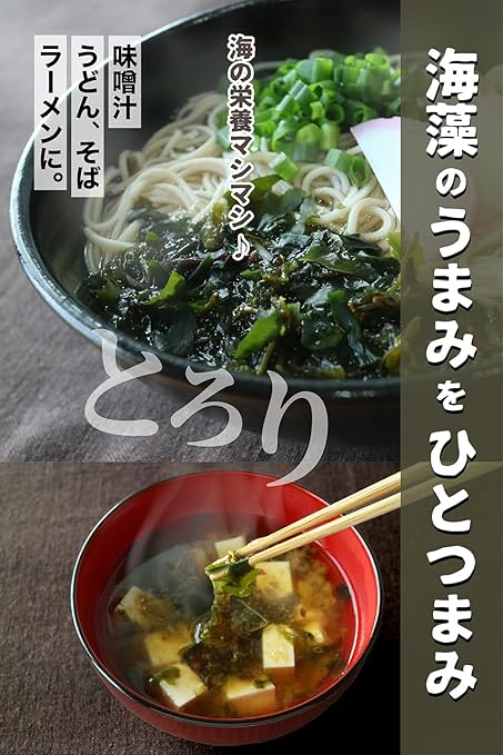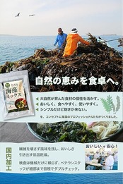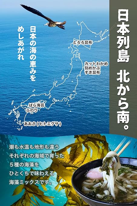 【とろみ と うまみ】北海道、三陸、愛媛、鹿児島。日本列島 北から南、水温も潮も地形も異なるそれぞれの海域で育った5種の海藻をひとくちで味わえる乾燥海藻ミックスです。味噌汁の具 にしたり、うどん、雑炊などにひとつまみ。パッと入れて、お箸でサッとひと混ぜすれば、とろり風味豊かな海藻のうま味をお楽しみいただけます。