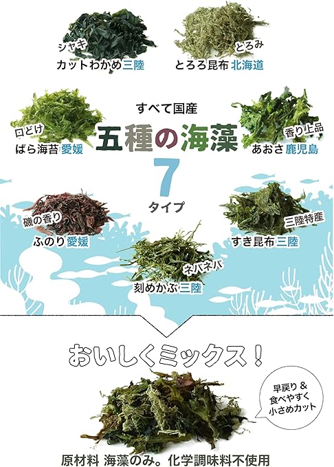 【7タイプの乾燥海藻をミックス】昆布、わかめ、海苔、ふのり、あおさ(ひとえぐさ)の5種類の海藻。昆布は すき昆布と とろろ昆布。わかめは カットわかめと 刻めかぶ 計7タイプの海藻をミッ