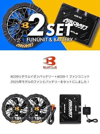 セット:リチウムイオンバッテリー×1 充電器×1 ファン×2 ファンケーブル×1 ファンフィルター×2 取扱説明書/保証書×1 ・AC09 リチウムイオンバッテリー