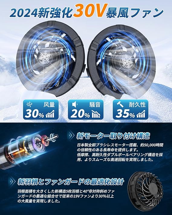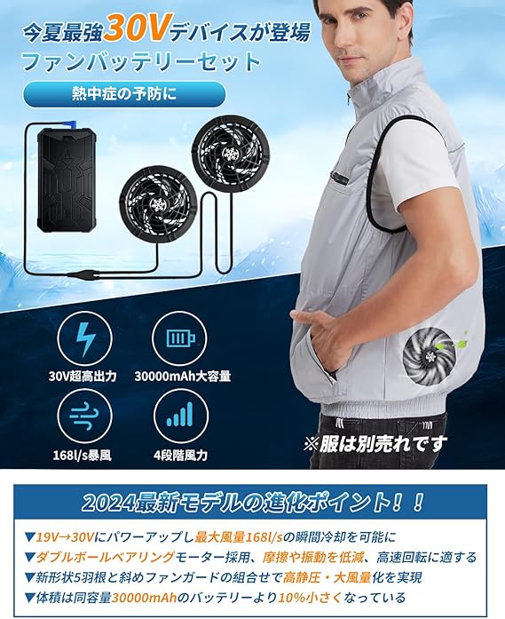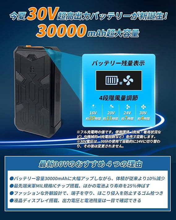 [Sumwind] 作業服 ファンバッテリーセット 30V超高出力 30000mAh大容量 日本製ブラシレスモーター 4段階風力調節 PSE認証済 現場作業 草刈り 釣り 熱中症対策 ファン付きベスト用 急速充電器付き 穴直径9cmの作業服適用 a