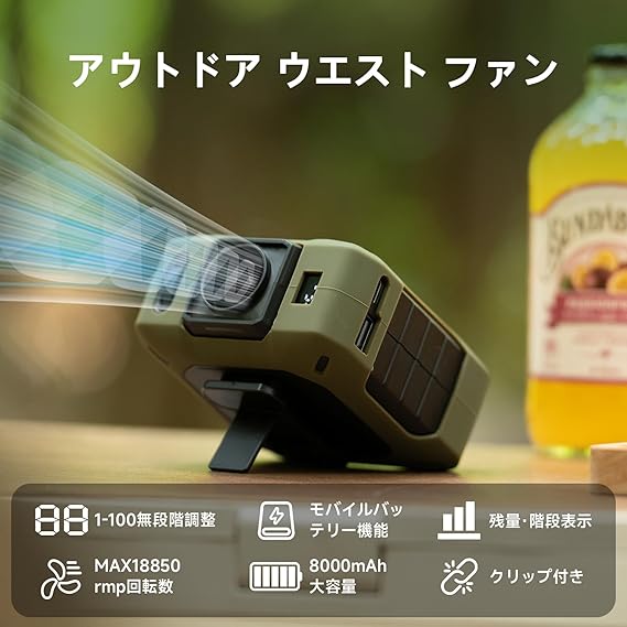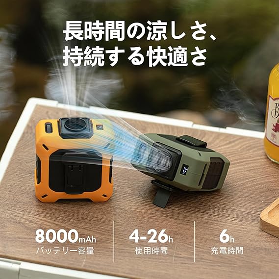 【緊急給電機能】 内蔵の大容量8000mAhで、アウトドアや日常のさまざまなシーンで大活躍。涼しさを提供する扇風機としての機能に加え、緊急時にはスマートフォンやタブレットへの給電も可能です。USB-AおよびUSB-C(5V/2A出力)ポートを搭載し、幅広いデバイスに対応します。