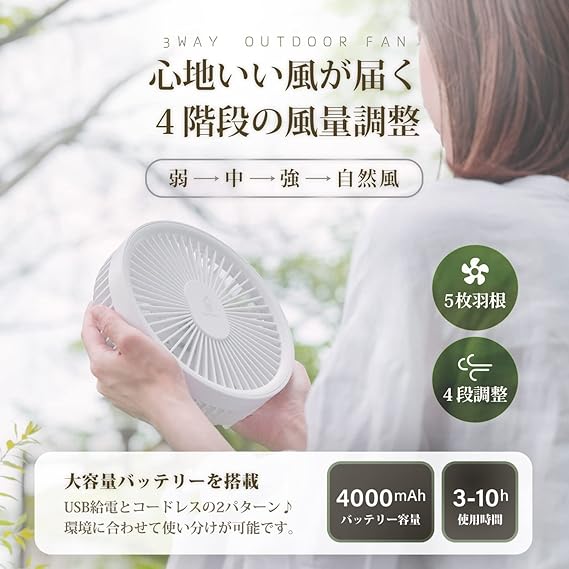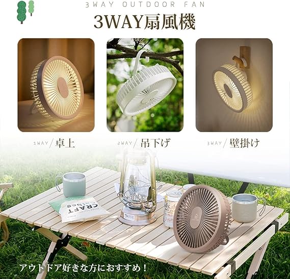 【2025年新型・1台3役 扇風機】 卓上・壁掛け・吊り下げの3Way ミニ扇風機です。コンパクトでシンプルなデザインはオフィスのデスクにもぴったり、洗面台にフックに引っ掛けるだけで壁掛け扇風機に早変わり、キッチンツールの掛け具などどこにも引っかかることが可能。さらに、テントやタープに吊り下げてシーリングファンとしてお使い頂けますので、あらゆる場所で活躍できます。