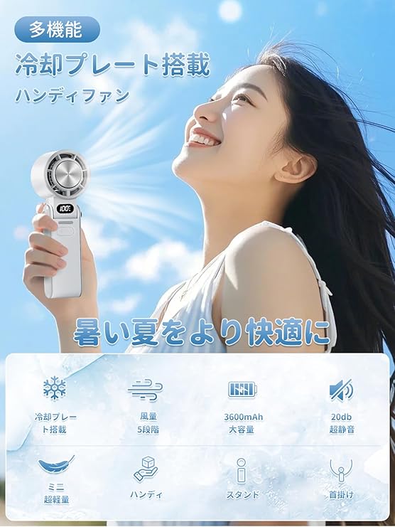 ハンディファン 冷却プレート【2025新型モデル・1S瞬間冷却・20dB静音】搭載 携帯扇風機 冷感 手持ち扇風機 ハンディ扇風機 5段階風力調節 長時間稼働 クーラー機能 ニファン 熱中症対策 USB充電式 小型 卓上 首掛け ストラップ付き カラビナ付き ホワイト(白) a
