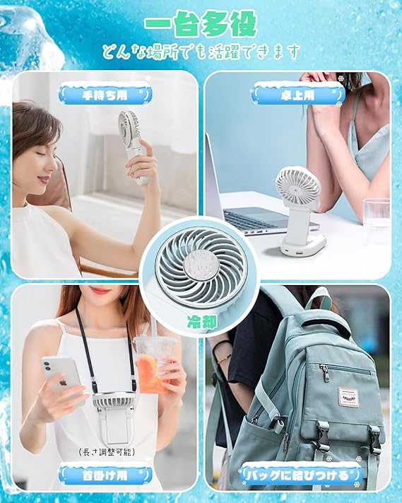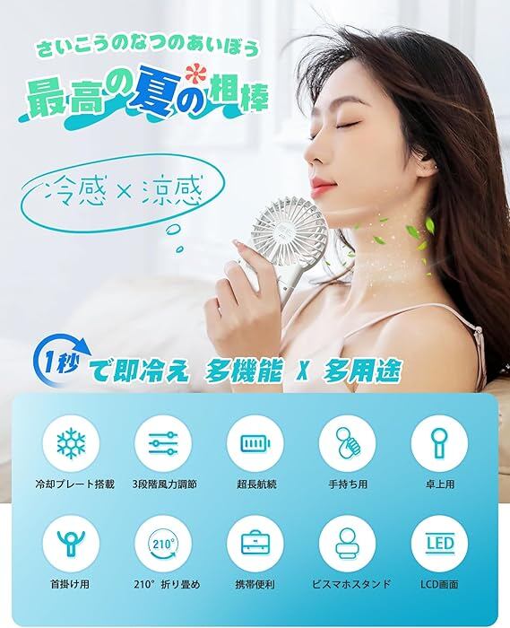 【冷却プレート搭載&LCD液晶画面表示機能付き携帯ファン】この冷却プレート内蔵の携帯扇風機、風を送るだけでなく、冷却スイッチを押すと冷却プレートが瞬時に冷却。 頬や額、手首、首元に当てるだけで、ひんやりとした涼感が広がります。肌に当てると瞬時にひんやりと涼しさを感じられます。冷たい風がサーッと広がるような清涼感です。真夏の酷暑の中でも、肌表面温度を外気温から最大20℃も下げ、ほてった顔を素早くクールダウン。熱中症予防に最適なアイテムです。 ハンディファンさらに高精細LCD画面を搭載,バッテリー