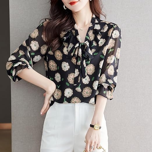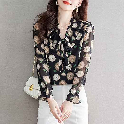 [Augseed] シャツ レディース ブラウス ボウタイブラウス 長袖 おしゃれ トップス 花柄 大きいサイズ シフォン 春 夏 制服 事務服 オフィスカジュアル フォーマル OL 通勤 薄手 シアー Vネック フリル パフスリーブ リボン 透ける 就活 a