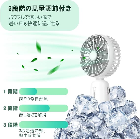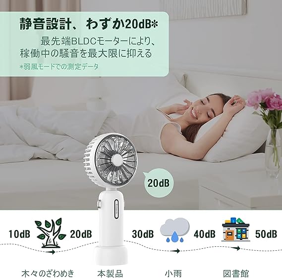 【小型てもパワフル ・ 20H長時間稼働】本携帯扇風機は革新技術のBLDCモーターを搭載しており、騒音を低減し、風力と風量を大幅にアップしました。30°斜めのサイクロン構造の4枚羽根と気流バランスのコア技術を採用することで、肌触りのよい自然に近い風を再現できます。4800mAh大容量バッテリーを内蔵するミニ扇風機で、1回のフル充電で最大20時間の連続使用が可能です。頻繁的に充電の手間を減少して、外出中でも電源切れことを心配入れません。いつでもどこでも夏の涼しさを楽しみます。