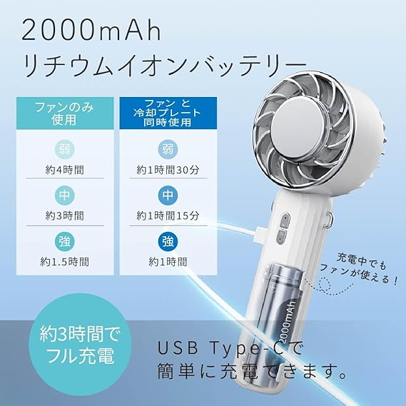 【 特 長 】 ◆ハンディファン、ネックファン、デスクファンの3WAY ◆冷却プレートで瞬間冷却 ◆3段階風力調整 ◆90度無段階調整 ◆USB充電(Type-C) ◆携帯用ストラップ付 ◆本体カラーはホワイト