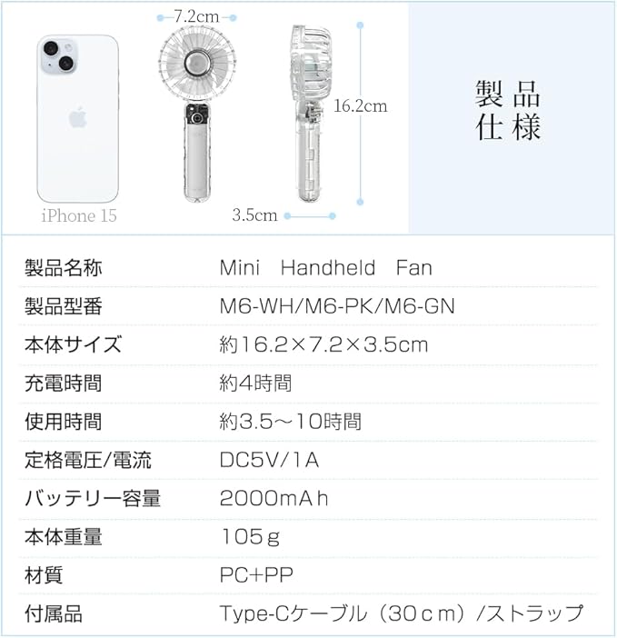 ハンディファン 手持ち扇風機 ?力 静音 ミニ扇風機 透明な外観デザイン カラフルな光LED付き 3段階風量調節 USB扇風機 2000mAhバッテリー 熱中症対策 おしゃれ 持ち運び 扇風機 (ホワイト) a