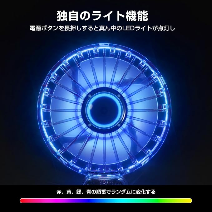 【透明デザインとオシャレなLEDライト】透明な外装とLEDライトが夜の雰囲気を演出し、さらに羽根の中心に設置されたLEDライトは、ランダムに色を変え、まるで虹のように輝いています。暑さを解消すると同時に、特別な雰囲気を演出してくれます。
