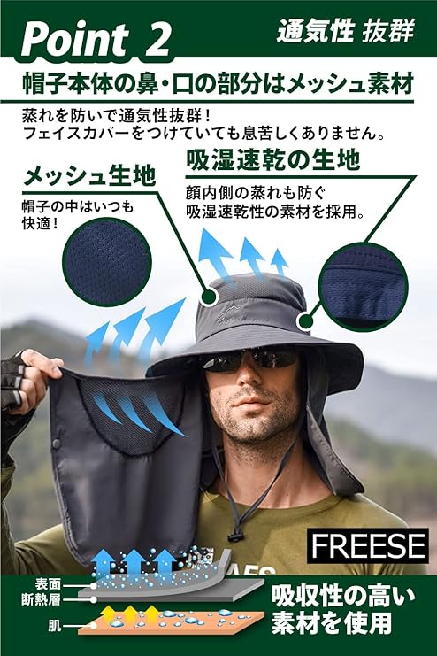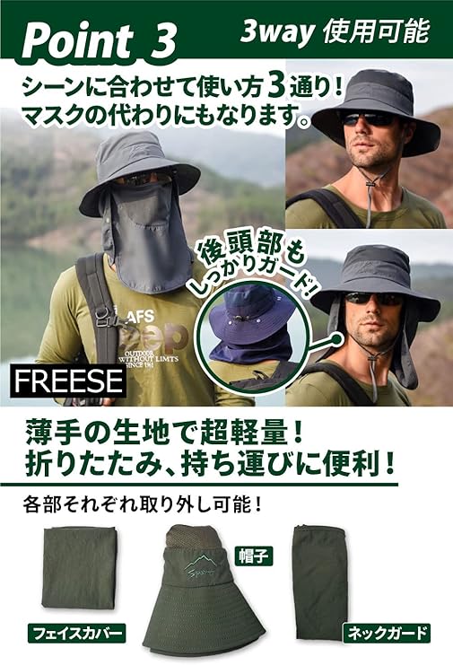 [FREESE] サファリハット つば広 帽子 メンズ 超軽量 吸湿速乾 メッシュ UVカット 花粉 日焼け防止 2way 折りたたみ 釣り 登山 アウトドア スポーツ