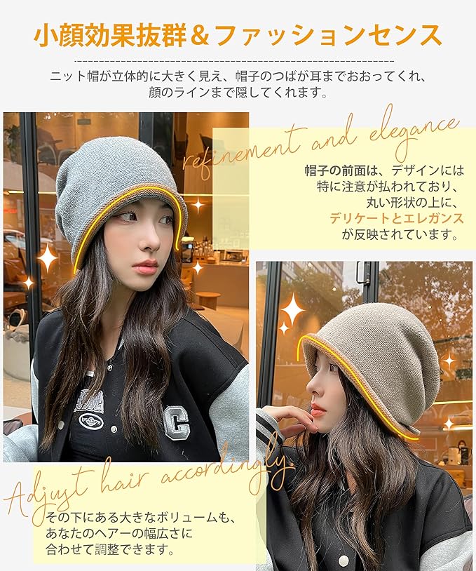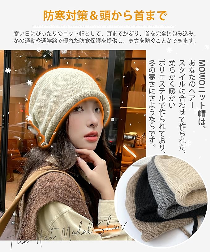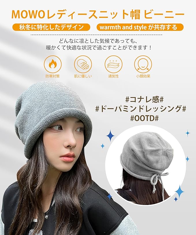 [MOWO] ニット帽 ニット帽子 レディース 秋冬 【調節ロープ付き・可愛い小顔・耳までまん丸と包む】 軽くて暖かい 大きいサイズ 防寒防風 保温 柔らかい 締め付け感ゼロ リボン 通気 ふんわり 帽子 ケア帽子 ビーニー帽 無地